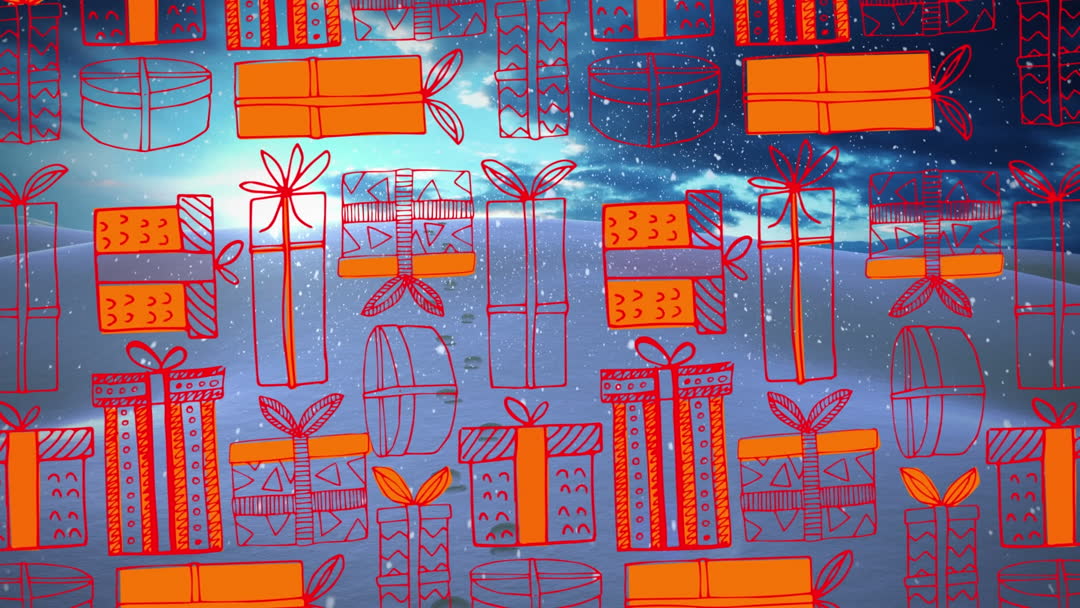 - Festive Gift Boxes with Falling Snow Over Winter Scenery