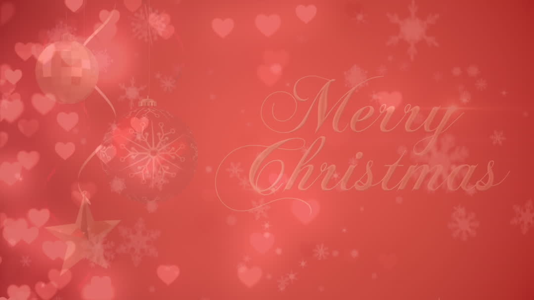 Red background filled with shimmering heart icons creates cheerful atmosphere, perfect for holiday cards, marketing materials, social media posts, and festive digital greetings. "Merry Christmas" text adds seasonal touch.