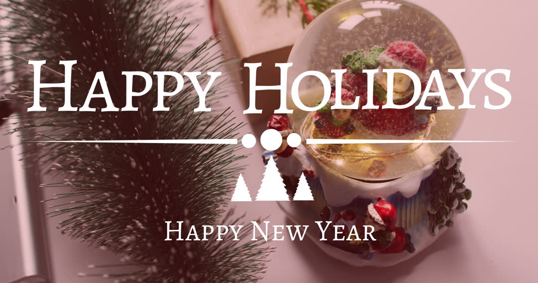 Digital animation displaying festive greetings with a prominent snow globe and decorative elements symbolizing Christmas and New Year celebrations. Ideal for use in holiday greeting videos, marketing material for festive promotions, or social media posts during the holiday season to emphasize seasonal cheer.