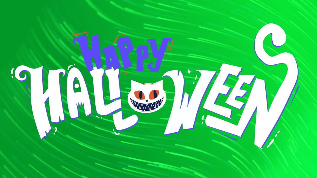Animation featuring the text 'Happy Halloween' in quirky, festive typography with bright colors on a dynamic green swirling background. Perfect for usage in Halloween event promotions, holiday greetings, decorative social media posts, and festive digital invites.
