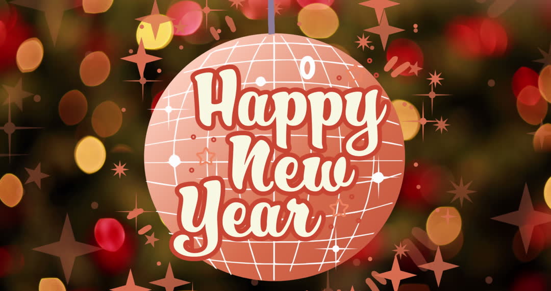 Illustrative artwork featuring a large, glittering ornament with 'Happy New Year' text. Ornament encompasses warm colors and shimmering lights evoking holiday festivity and cheer. Ideal for use in digital cards, social media graphics, or festive new year announcements.