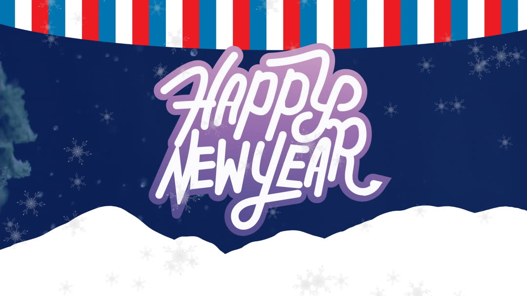 Charming holiday graphic features stylish 'Happy New Year' text set against backdrop of falling snowflakes. Ideal for festive digital invitations, social media posts celebrating New Year, or animated touchpoints on websites during holiday season. Perfect for conveying cheerful and optimistic vibes associated with New Year celebrations.