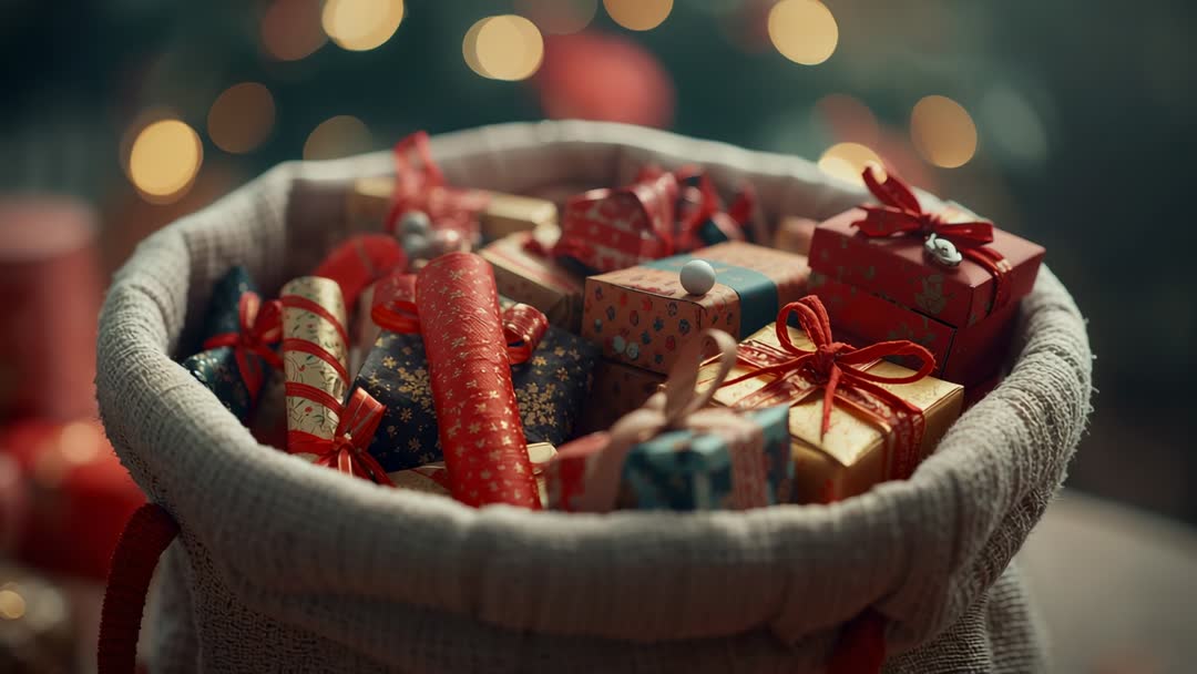 - Festive Holiday Evening with Colorful Gift Boxes in Sack