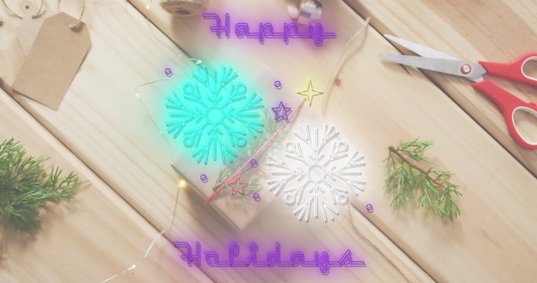 Scene showcasing beautifully wrapped gift on wooden table, flanked by sprigs of evergreen and rustic wrapping supplies. Snowflake and light embellishments add cozy holiday atmosphere, with 'Happy Holidays' message creating welcoming seasonal vibe. Ideal for seasonal promotions, festive social media posts, or holiday planning presentations.