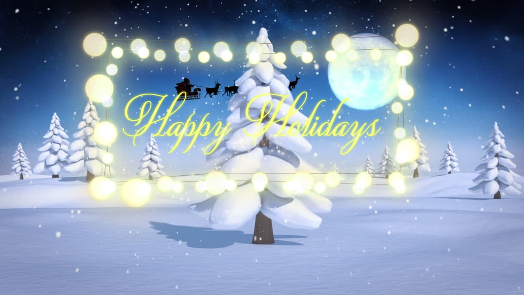 Festive seasonal design features a vibrant 'Happy Holidays' message over a snowy landscape. Floating lights add a magical touch against the backdrop of snow-covered trees under a bright full moon and Santa's silhouetted sleigh crossing the sky. Perfect for holiday card designs, winter festival promotions, digital holiday invitations, or social media season's greetings.