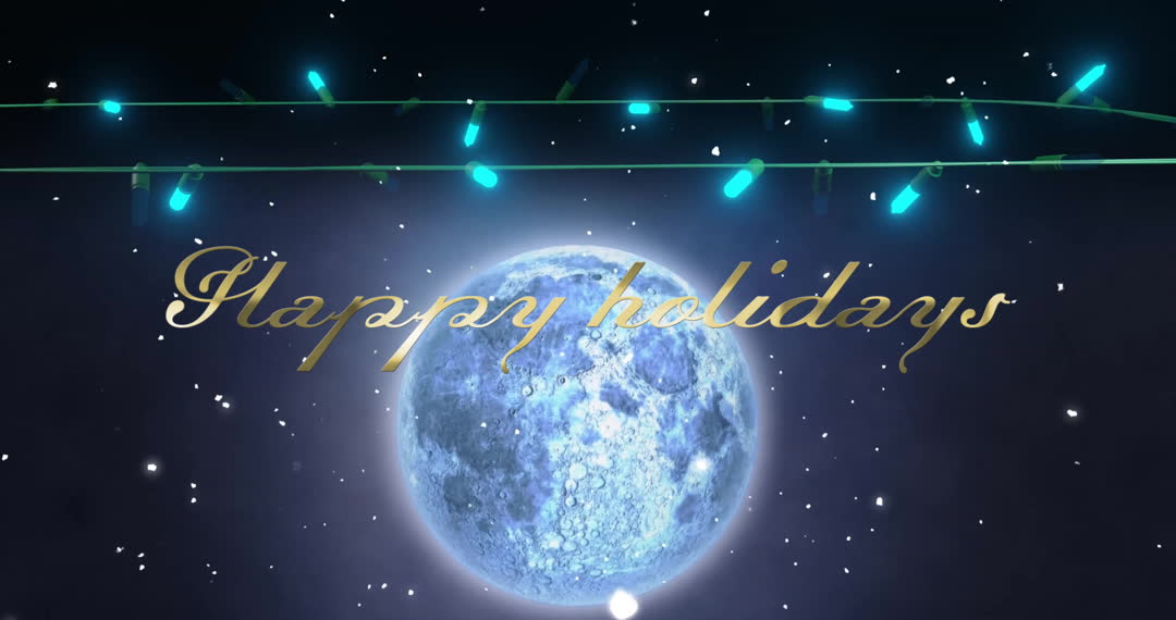 Festive scene features digitally created 'Happy holidays' text with illuminating string lights above a globe. Ideal for creating a festive and global-themed holiday card, promotional material, or greeting animation during holiday seasons.