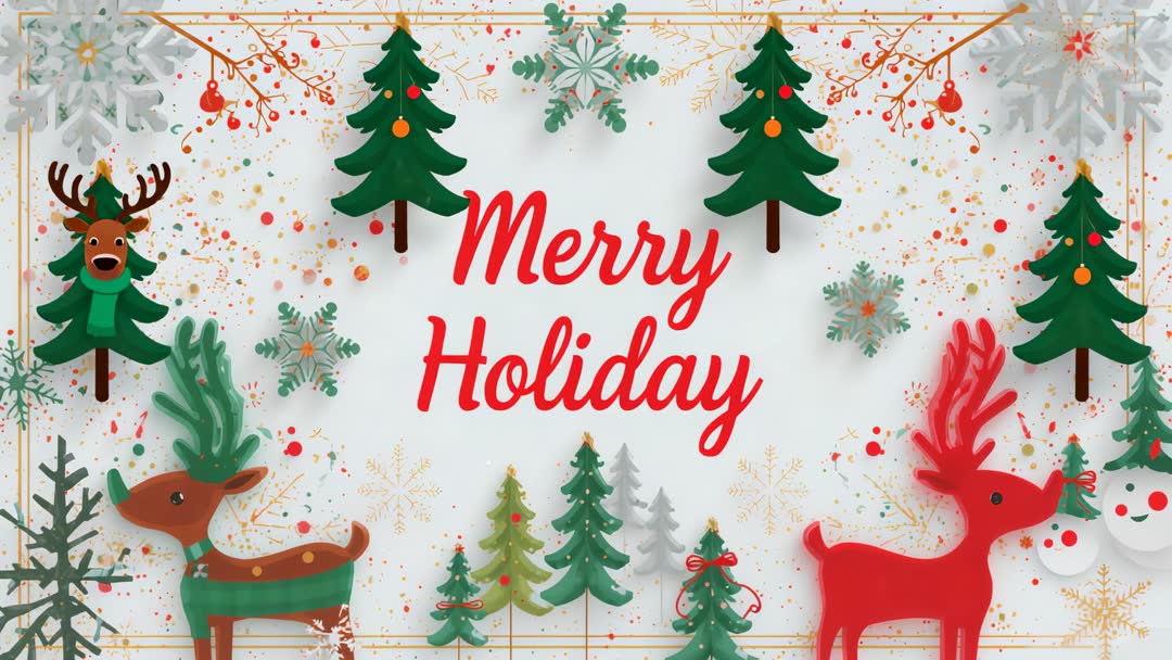 AI Generated Video. Cheerful holiday scene featuring red scripted 'Merry Holiday' text surrounded by decorative elements such as reindeer in playful poses, holiday trees adorned with ornaments, confetti, and intricate snowflakes. This welcoming and vibrant imagery captures the spirit of the festive season, making it an ideal addition for seasonal greeting cards, winter festival promotions, or Amazon home decor listings to evoke holiday cheer.