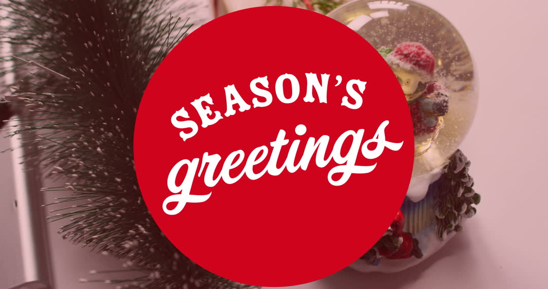 Festive design featuring holiday-themed text 'Season's Greetings' over a snow globe with Christmas decorations. Perfect for greeting card designs, holiday promotions, and festive invitations.