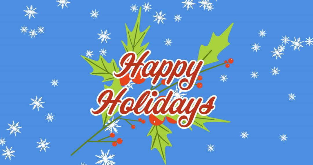Colorful greeting featuring holiday-themed graphics of holly leaves and snowflakes on a blue backdrop. Suitable for digital holiday cards, festive social media posts, and seasonal decorations.