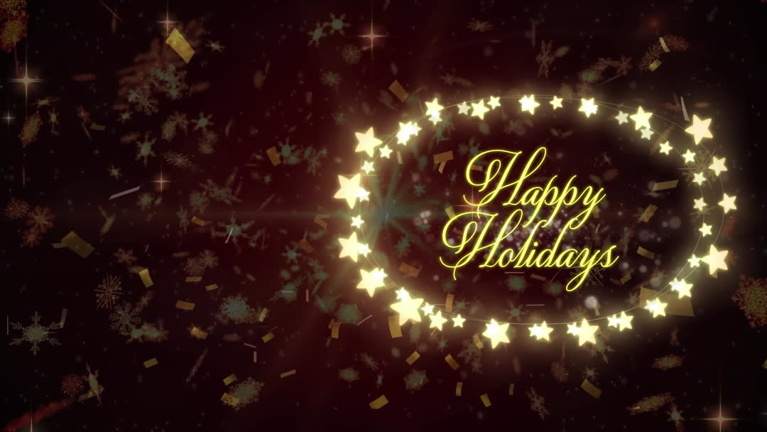 Festive animation displays 'Happy Holidays' with stars around apparel text and confetti background. Ideal for holiday greeting cards, invitations, and promotional materials. Easily captures festive spirit and joy of the season.