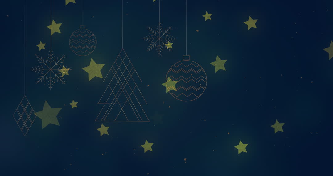 Elegant design featuring holiday motifs like Christmas ornaments, yellow stars, and snowflakes on a dark background, conveying a festive and winter atmosphere. Ideal for holiday cards, seasonal promotions, or festive digital backgrounds.