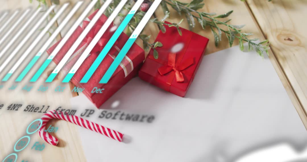 Engaging digital scene shows transformation from gift boxes to data overlays, illustrating holiday sales growth and analytics in a festive setting. Ideal for use in commercials depicting holiday sales strategy, business presentations on seasonal market trends, or promotional campaigns focused on data-driven holiday successes.