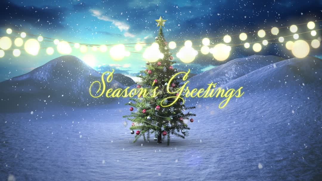 Digital illustration showing a decorated Christmas tree with glowing fairy lights set in a snowy winter landscape. The scene is complemented by falling snowflakes and a 'Season's Greetings' message, creating a warm holiday atmosphere. Ideal for holiday cards, festive marketing materials, and seasonal digital campaigns.