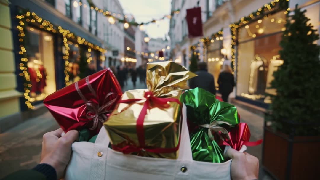 AI Generated Video. Walking through a bustling market street adorned with festive decorations, a shopper carries a canvas tote full of colorfully wrapped gifts. City lights and garlands create a warm illumination, capturing the excitement and joy of holiday shopping. Ideal for usage in promotional materials for retail businesses, illustrating festive shopping experiences, or using in blogs celebrating holiday events.