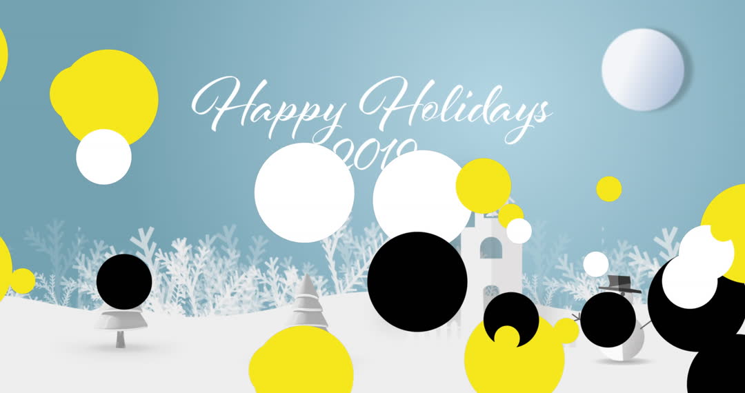 Festive digital artwork displaying holiday-themed animation featuring a 'Happy Holidays' message on a serene blue background, accented with bright spots. Ideal for use in holiday greetings, digital Christmas cards, website headers, or festive social media posts. The artwork captures holiday spirit, offering visual cheer with its playful color palette and joyful message.