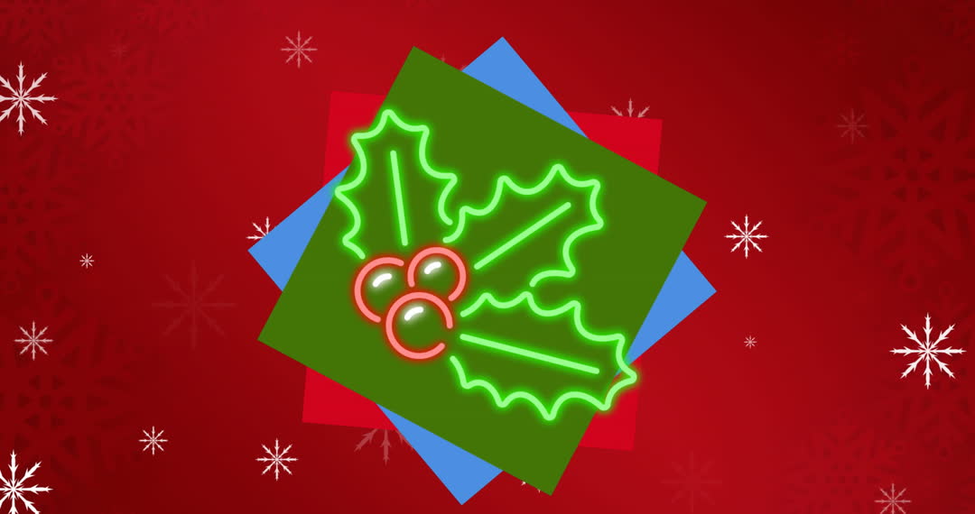 This vibrant animation features glowing holly leaves surrounded by falling snowflakes against a colorful backdrop. Perfect for use in holiday-themed digital content or promotional materials, it brings a playful and joyful atmosphere to any Christmas celebration project.