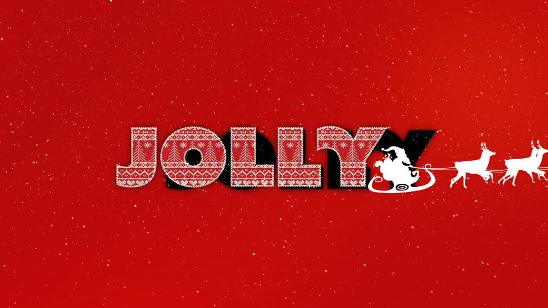 Playful depiction of 'Jolly' with Santa silhouette and reindeer on vibrant red background. Ideal for festive greetings, holiday advertisements, or Christmas-themed designs.