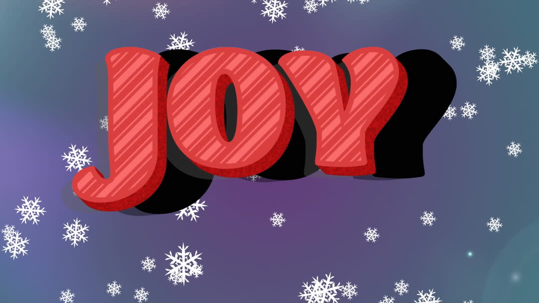 Captivating animation showcases colorful 'Joy' text surrounded by snowflakes, symbolizing holiday spirit. Ideal for use in Christmas greeting cards, festive social media posts, or winter-themed promotional materials to spread cheer and joy during holiday season.