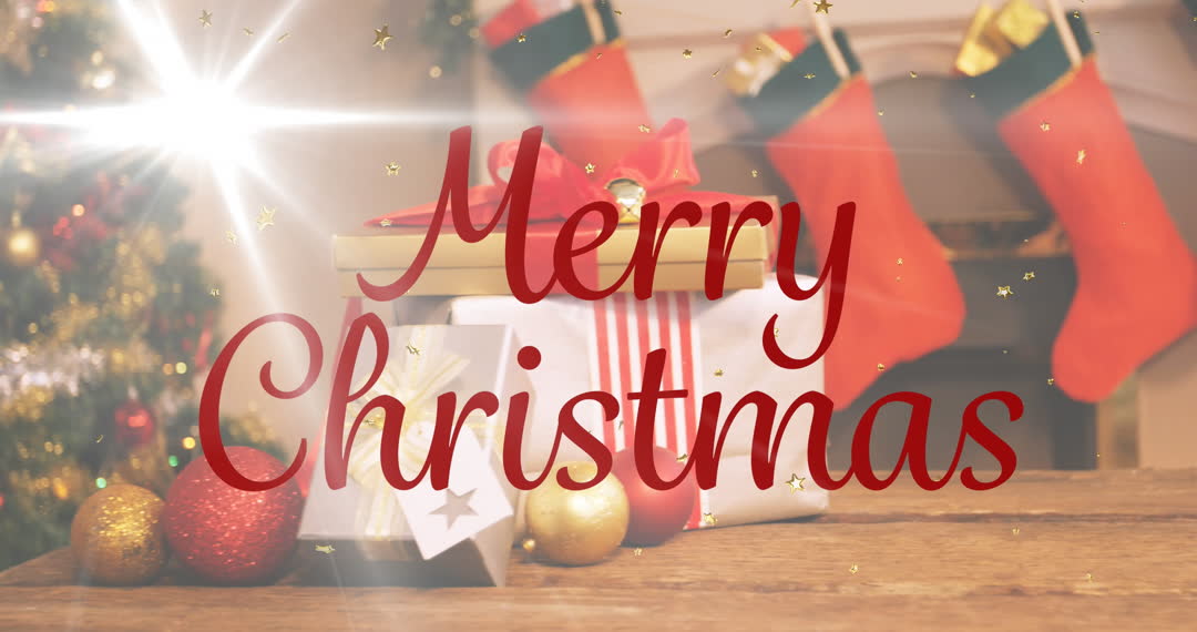 Twinkling golden stars sparkle around a Merry Christmas message amid decor and gifts, evoking the joy of the festive season. Ideal for holiday greetings, promotional materials, festive invitations, or digital banners celebrating Christmas celebrations.