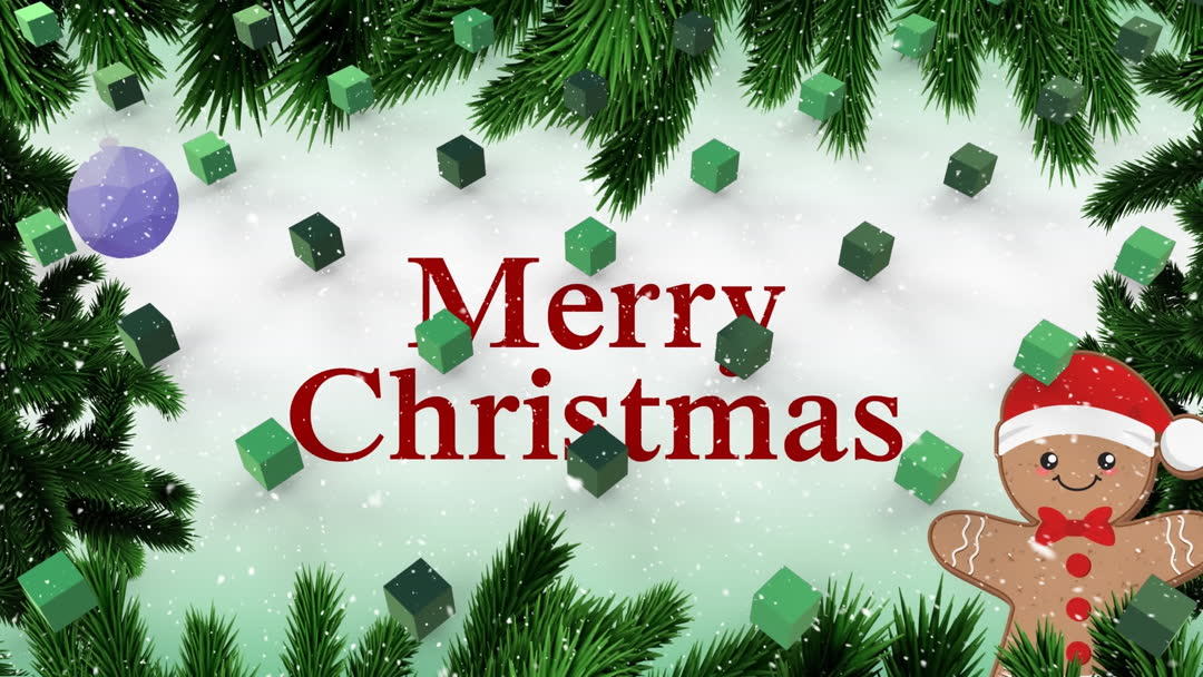 Merry Christmas message alongside a smiling gingerbread ornament accented by green cubes and the rich green of fir branches. Snowfall effect enhances traditional holiday feel. Ideal for Christmas cards, web banners, or festive invitations.