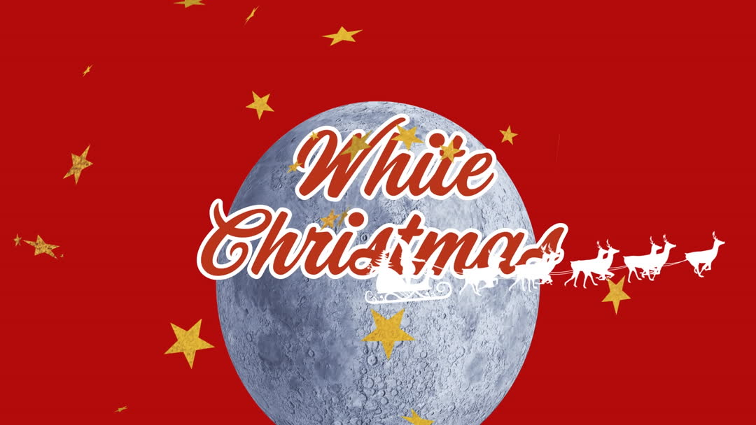 Illustration featuring Santa's sleigh crossing a full moon with a festive, holiday-theme backdrop. Elements include bright red background, golden stars, and standout "White Christmas" text. Ideal for Christmas greeting cards, holiday banners, or social media festive season promotions to evoke holiday spirit.
