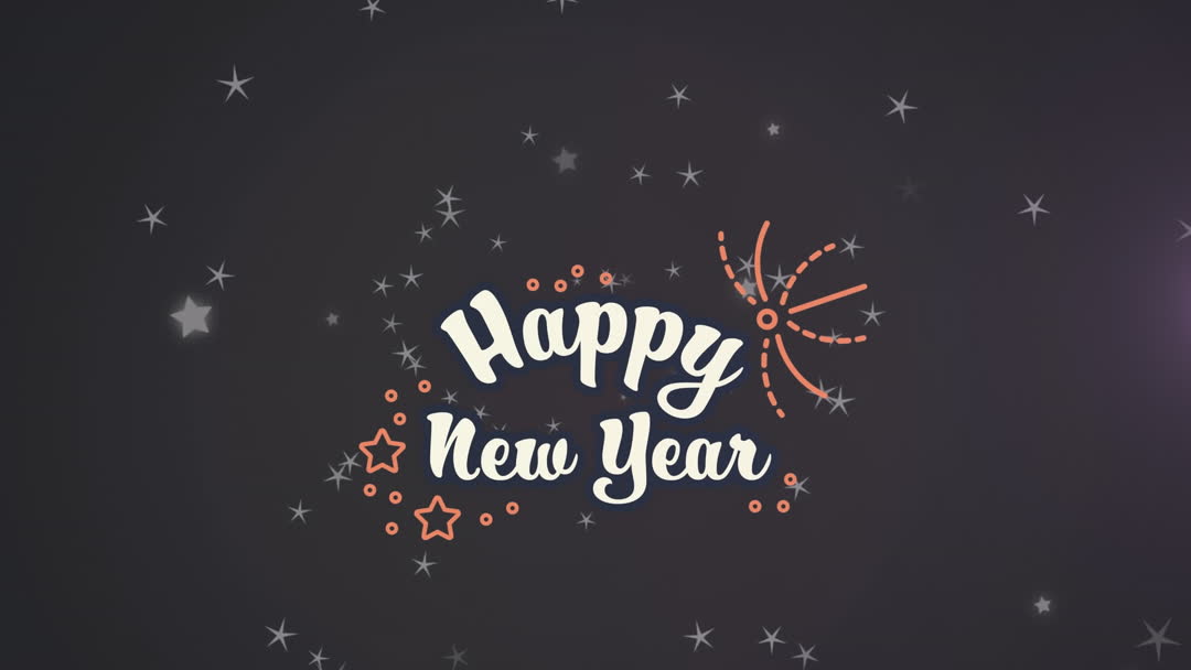 Graphic displaying 'Happy New Year' message with festive elements like stars and fireworks design. Suitable for holiday greeting cards, seasonal promotions, social media wishes. Perfect for adding a celebratory touch to your electronic communications.