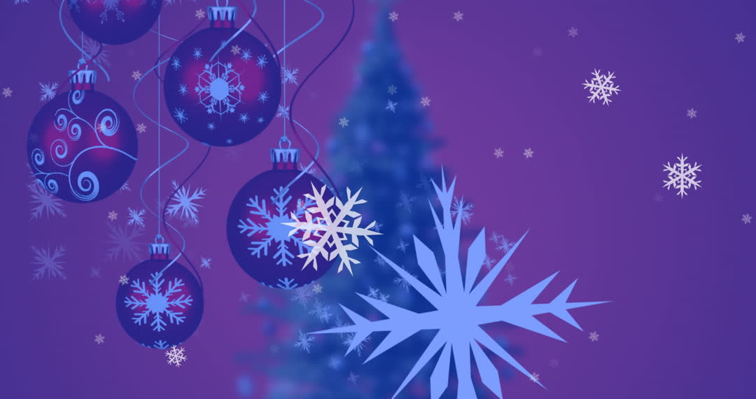 Glowing snowflakes with vibrant Christmas ornaments create a lively festive theme. Suitable for holiday marketing templates, greeting cards, seasonal advertisements, or as a background for Christmas-themed media projects.