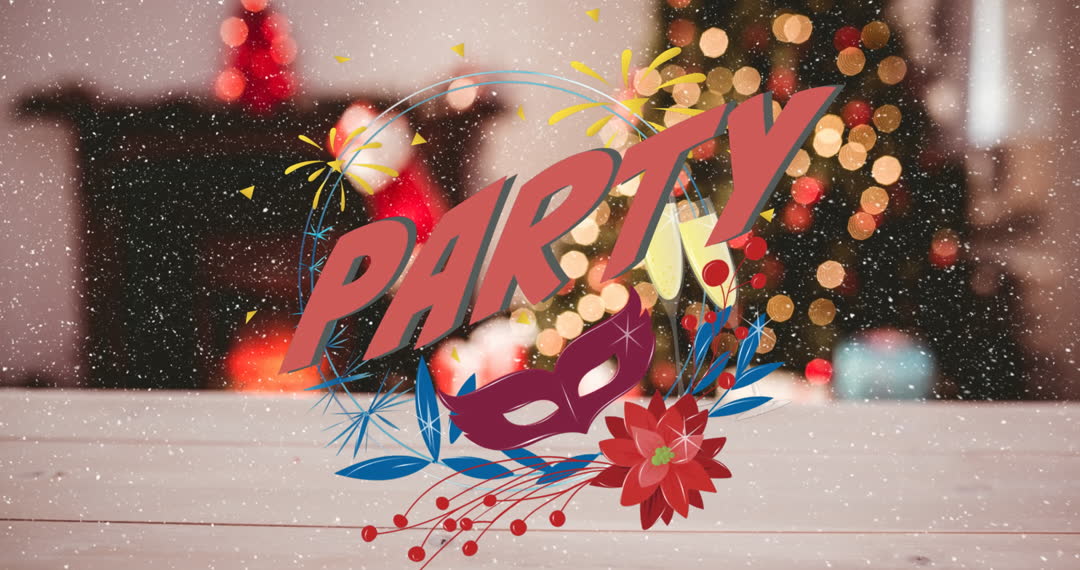 This vibrant graphic features the word 'party' amidst snowflakes and an array of decorative elements, including a masquerade mask and Christmas ornaments. Ideal for holiday party invitations, social media posts, and festive event flyers in winter celebrations. The blurred Christmas tree lights add warmth and excitement, capturing the holiday spirit perfectly.