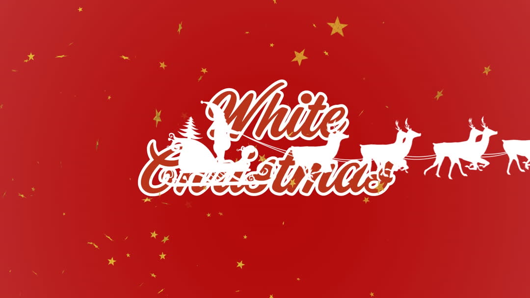 Bright and joyful red background featuring animated white text 'White Christmas' with a festive illustration of Santa Claus in a sleigh pulled by reindeer. Ideal for holiday cards, festive advertisements, or social media promotions during the Christmas season. Offers traditional and cheerful motif suitable for conveying holiday spirit and celebration.