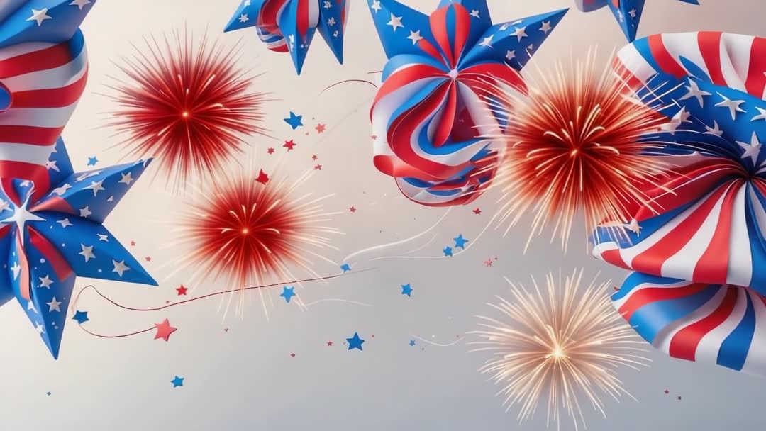 AI Generated Video. Featuring lively red, white, and blue pinwheels amid a backdrop of star confetti and bursting fireworks. Perfect for illustrating patriotic themes like Independence Day, national celebrations, and similar festive occasions. Vibrant colors and energetic composition make it ideal for advertisements, greeting cards, party invitations, and social media event announcements celebrating national pride.