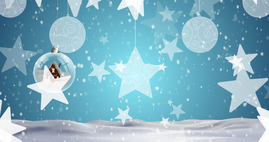 This artistic illustration captures a bright, festive atmosphere with animated snow falling over delicate Christmas decorations, featuring stars and a snug home in a snow globe. Ideal for holiday-themed projects, this vector illustration is perfect for Christmas greeting cards, seasonal advertising, and winter celebration backdrops.
