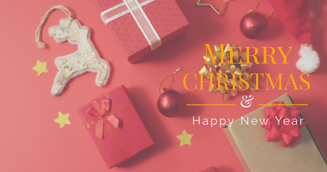Digitally designed greeting card featuring holiday message 'Merry Christmas & Happy New Year', surrounded by Christmas gifts, decorations, and warm colors. Useful for sending festive greetings, online invitation, holiday marketing materials, and decoration inspiration during the festive season.