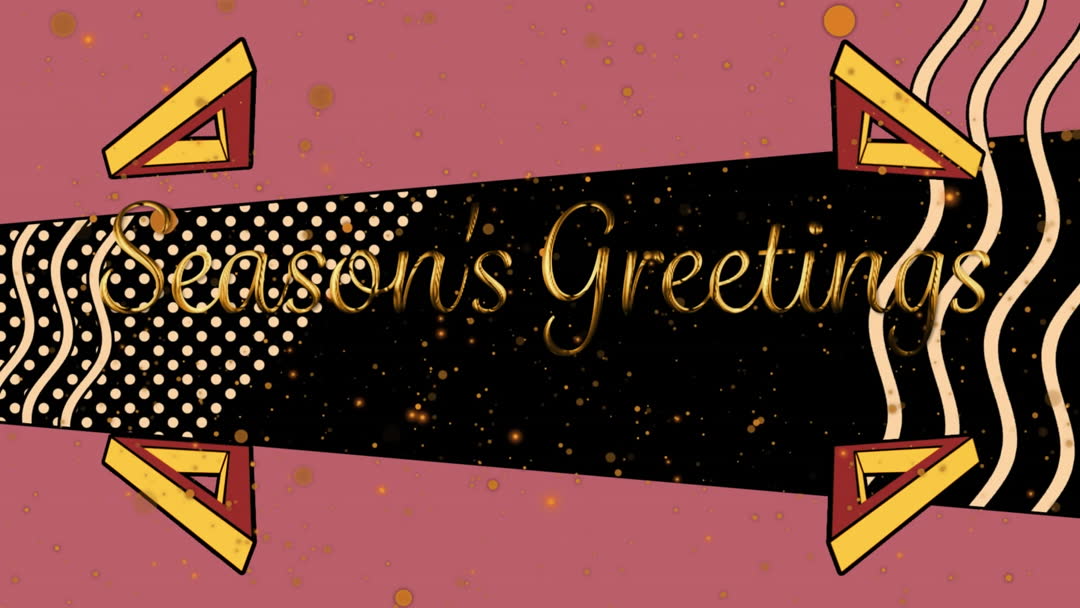This vibrant animation features Season's Greetings text in a modern and abstract style with geometric triangles and shapes. The blend of digital art elements and festive feel suits holiday greetings, Christmas or New Year’s invitations, social media posts, and festive event announcements. The combination of black background with colorful patterns enhances the celebratory tone, conveying warmth and joy.