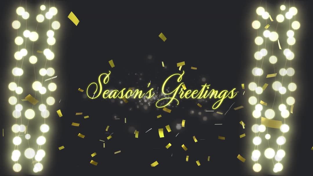 Bright and joyful digital design featuring elegant holiday message 'Season's Greetings' surrounded by glowing fairy lights and floating confetti. Perfect for use in creating festive e-cards, designing holiday invitation banners, or for enhancing themed web pages during the Christmas and holiday season.