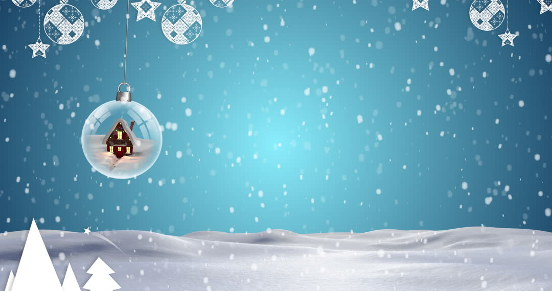 Christmas-themed scene depicts a snow globe with a cozy cabin amid falling snow, set against a bright blue background with decorative baubles. Ideal for festive greeting cards, holiday emails, or as whimsical digital wallpaper during the Christmas season, conveying warmth and celebration.