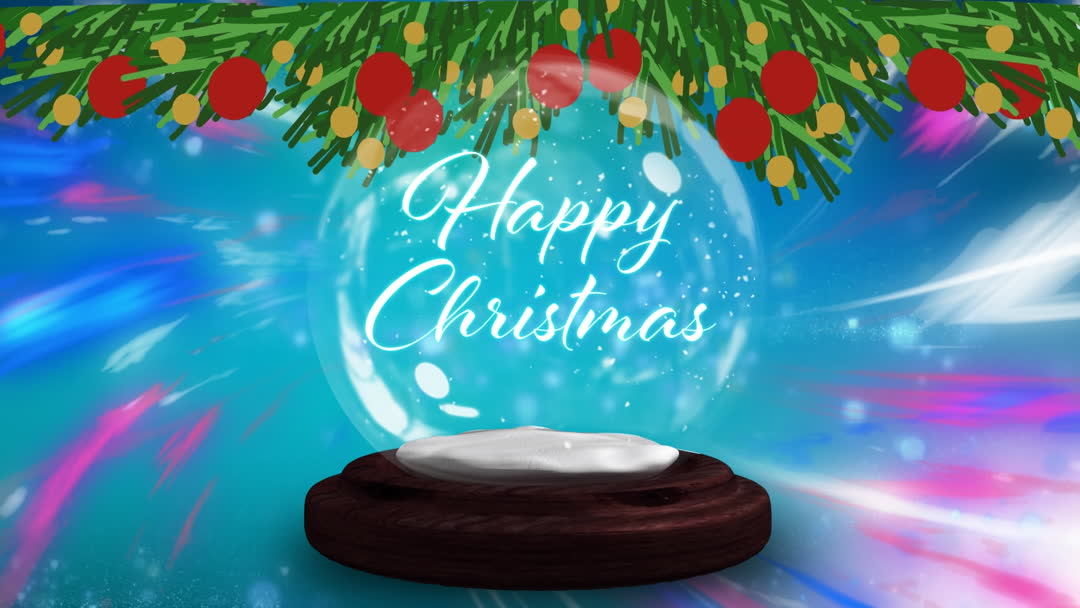 Enchanting digital animation displaying a Christmas snow globe against a vibrant background with glowing lights. Branches adorned with ornaments frame the top, and 'Happy Christmas' is gracefully displayed. Ideal for holiday wishes, festive marketing materials, greeting cards, and digital celebrations. Perfect choice for adding a touch of seasonal warmth and decoration to promotional campaigns and online content.