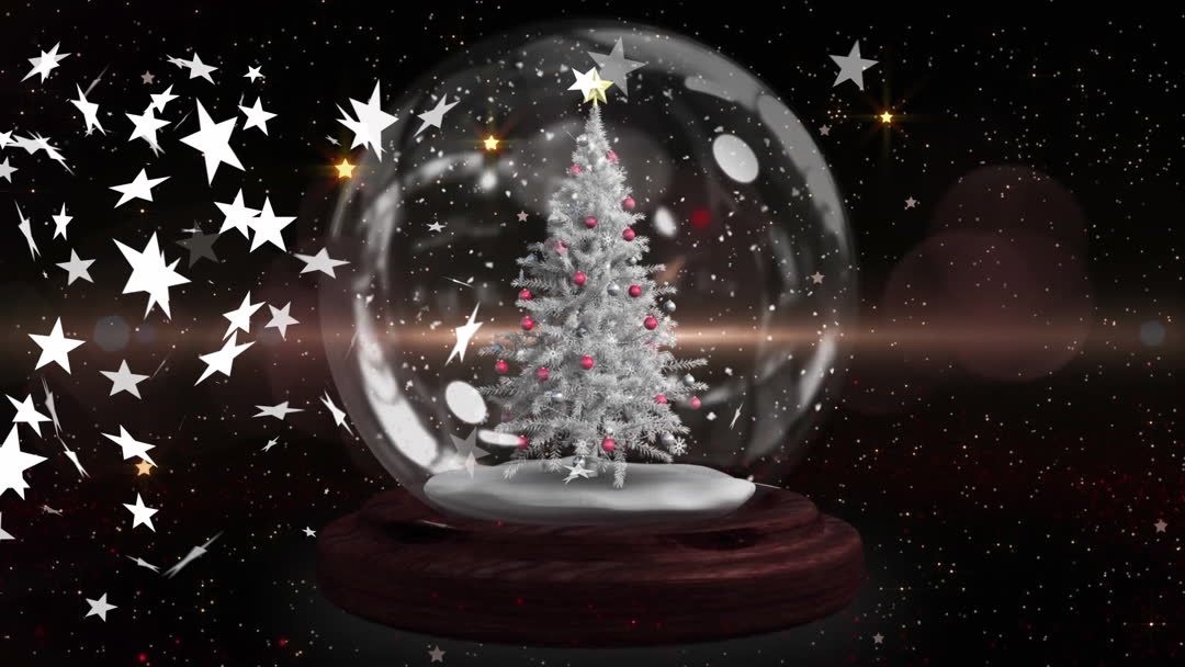 Inside the globe, a beautifully decorated Christmas tree with red ornaments sits, surrounded by swirling white stars against a dark, sparkling background. Ideal for holiday-themed marketing materials, greeting cards, or festive event invitations, capturing the magic of the season.