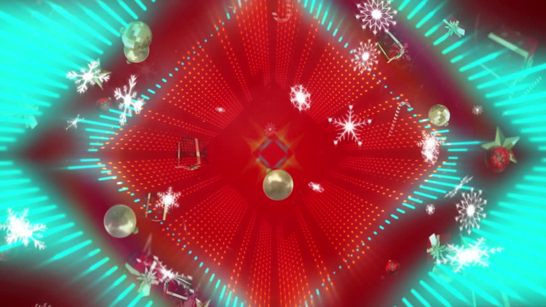 Vibrant animation featuring snowflakes, baubles, and candy set against a colorful neon kaleidoscopic background. Perfect for seasonal greetings, holiday card design, digital art projects centered around festive themes, and adds a lively touch to Christmas marketing materials.