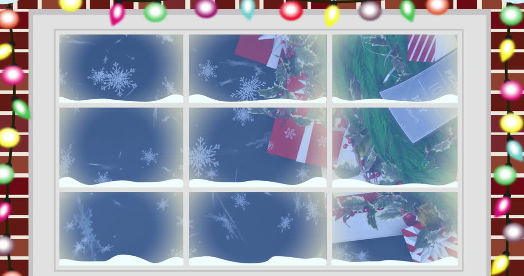 View of falling snowflakes over Christmas decorations including wreaths and presents seen through a window frame with holiday lighting. Ideal for holiday greetings, festive digital backdrops, or winter-themed presentations.
