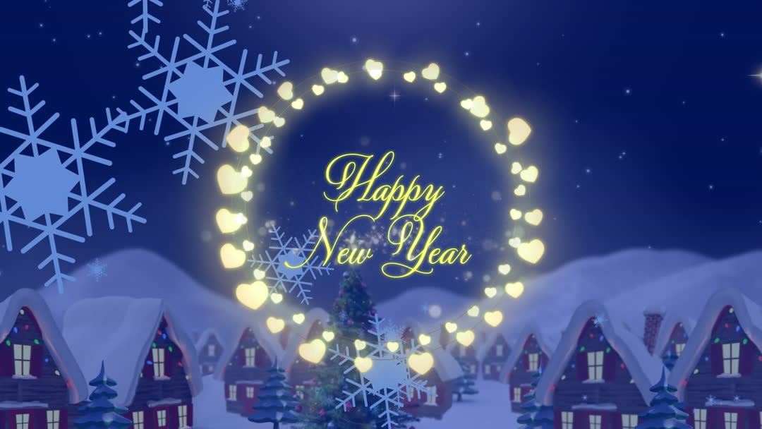 Nighttime winter scene with snow gently falling on picturesque village decorated with Christmas lights. Heart-shaped lights form 'Happy New Year' message, perfect for holiday greetings, festive event promotions, cheerful New Year wishes, invoking a joyful, seasonal atmosphere.
