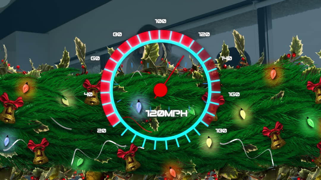 This video merges the concept of speed with the festive spirit, showcasing a vibrant speedometer overlayed on a garland adorned with Christmas decorations like lights, holly leaves, and red bows. Ideal for holiday-themed promotions, event announcements, and festive decoration guides.