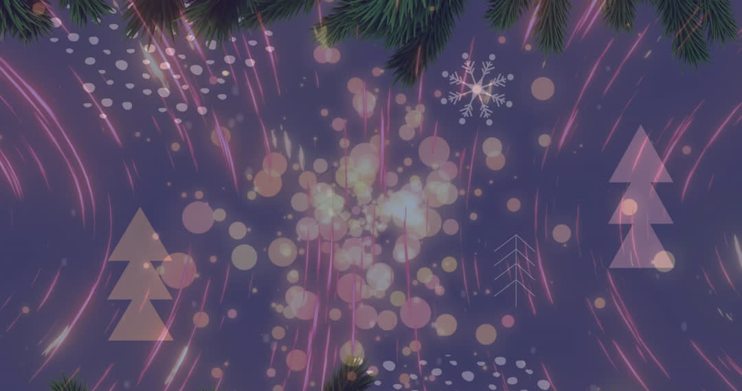 This vibrant scene showcases a festive winter animation with Christmas trees, twinkling bokeh lights, and snowflakes against a dark blue backdrop. Colorful streaks create a joyful atmosphere, perfect for holiday-themed projects, greeting videos, or festive presentations. Its abstract yet lively aesthetic makes it an ideal choice for creative uses, adding seasonal cheer to digital platforms or social media.