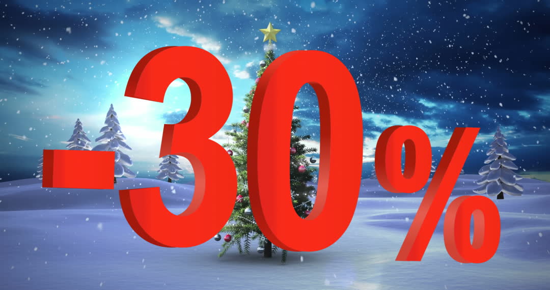 Ideal for use in holiday marketing and retail campaigns, featuring a prominent 30 percent discount against a festive winter background that includes a Christmas tree and snow. Versatile for advertisements promoting winter sales events, Christmas discount offers, or end-of-year promotional activities where a festive, eye-catching design is desired.