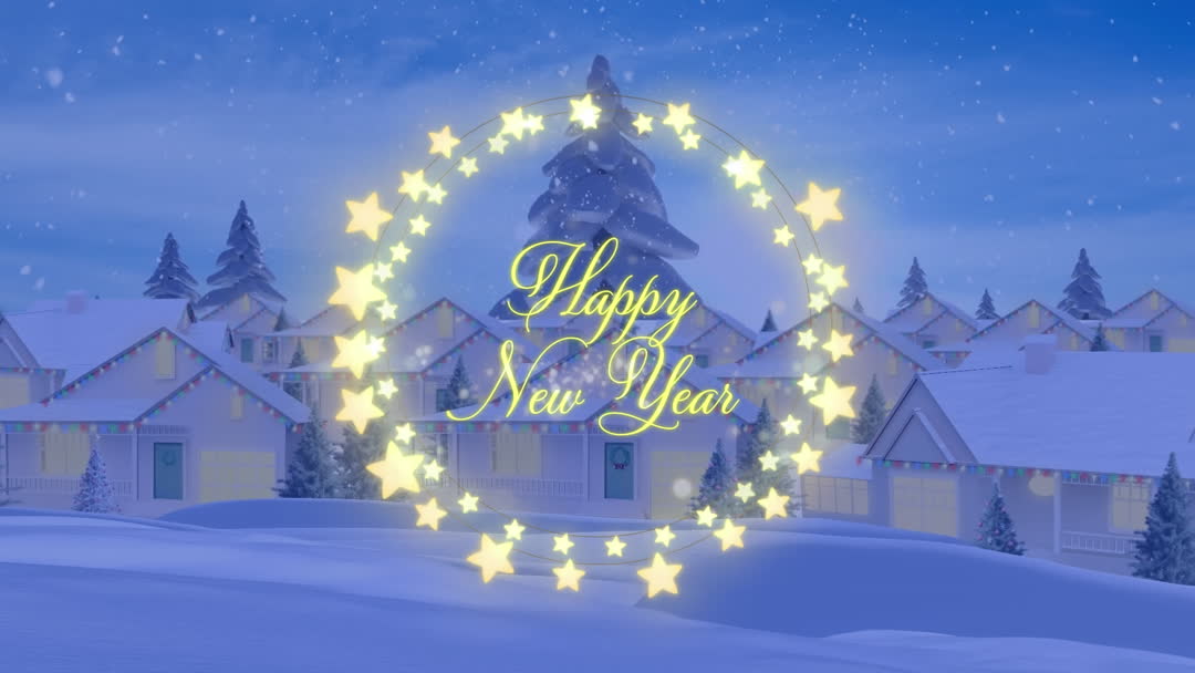 This stock footage features a charming winter setting with snow-covered cottages and gently falling snowflakes. A festive glow rings a 'Happy New Year' message enhanced by stars. This cheery clip is perfect for holiday greetings and festive videos, making it ideal for creators and businesses pursuing joyful seasonal messages or decorative additions for Christmas and New Year's themes.