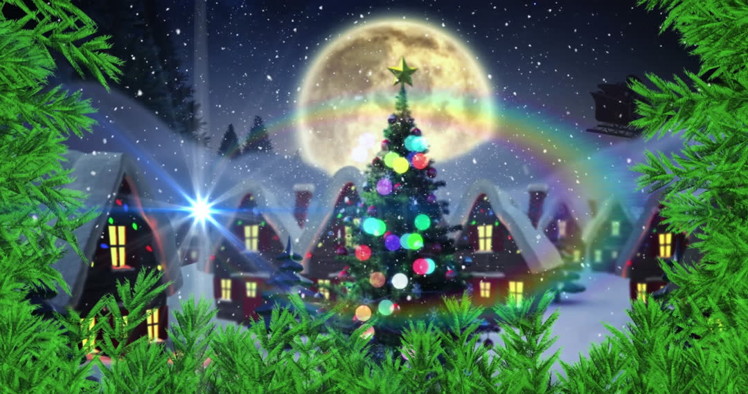Charming animated winter scene captures festive spirit with a brightly lit Christmas tree in a snow-covered village. Scene includes magical shooting star and full moon, conveying holiday joy and warmth. Useful for holiday greetings, animations, and festive promotional materials to celebrate Christmas season full of cheer and tradition.