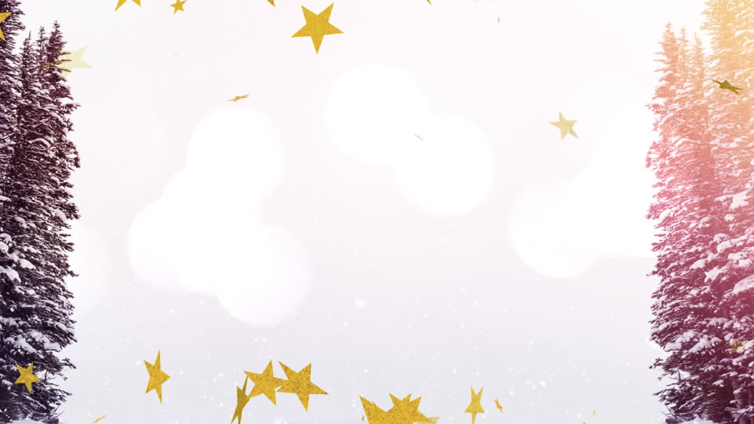 Magical animation featuring falling snow and golden stars over snowy trees, capturing the enchantment of the winter holiday season. Perfect for festive greeting cards, holiday event promotions, and Christmas-themed multimedia projects.