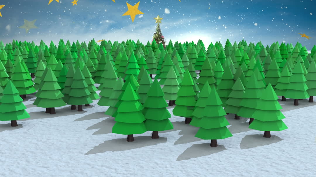 Charming scene portraying a dense forest of animated Christmas trees in a snowy landscape, illuminated by sparkling stars against a festive sky. Ideal for use in holiday promotions, greeting cards, social media posts, and festive advertisements to capture the magic of Christmas celebration and the beauty of winter landscapes.