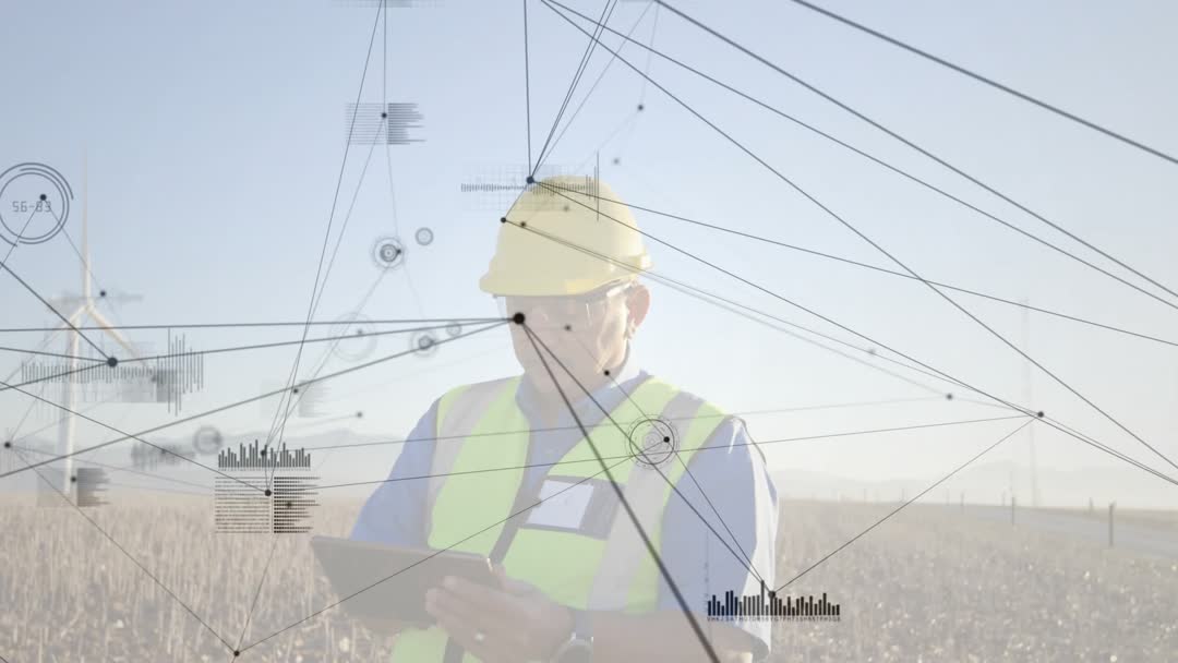 In a sunlit field, a field engineer wearing safety gear is engaging with a tablet, assessing wind turbine information displayed through an animated network that symbolizes technology and connectivity within the renewable energy sector. This videory represents the blend of technology and environmental stewardship, showcasing innovation and data analytics as essential tools for achieving sustainability and improved energy efficiency. Ideal for use in content related to renewable energy production, advances in industrial technology, or showcasing innovative network systems.