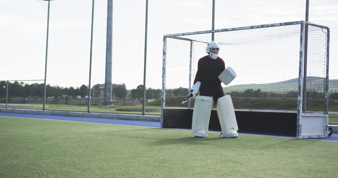 Image depicts a field hockey goalie in full protective gear, preparing in front of the goal. Useful for illustrating sports concepts, teamwork, or discussing goalie techniques and strategies.