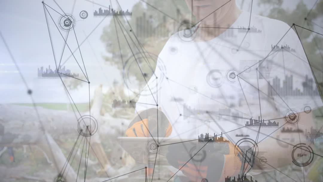 A scene with a field technician on a lakeshore manages tasks through a tablet. Animated network nodes overlaying signifies advanced technological interactions and real-time monitoring of data connectivity outdoors. This could be used to represent futuristic surveillance systems, communications technology, or innovations in fieldwork. Ideal for use in marketing materials for technology services and educational content regarding data systems.